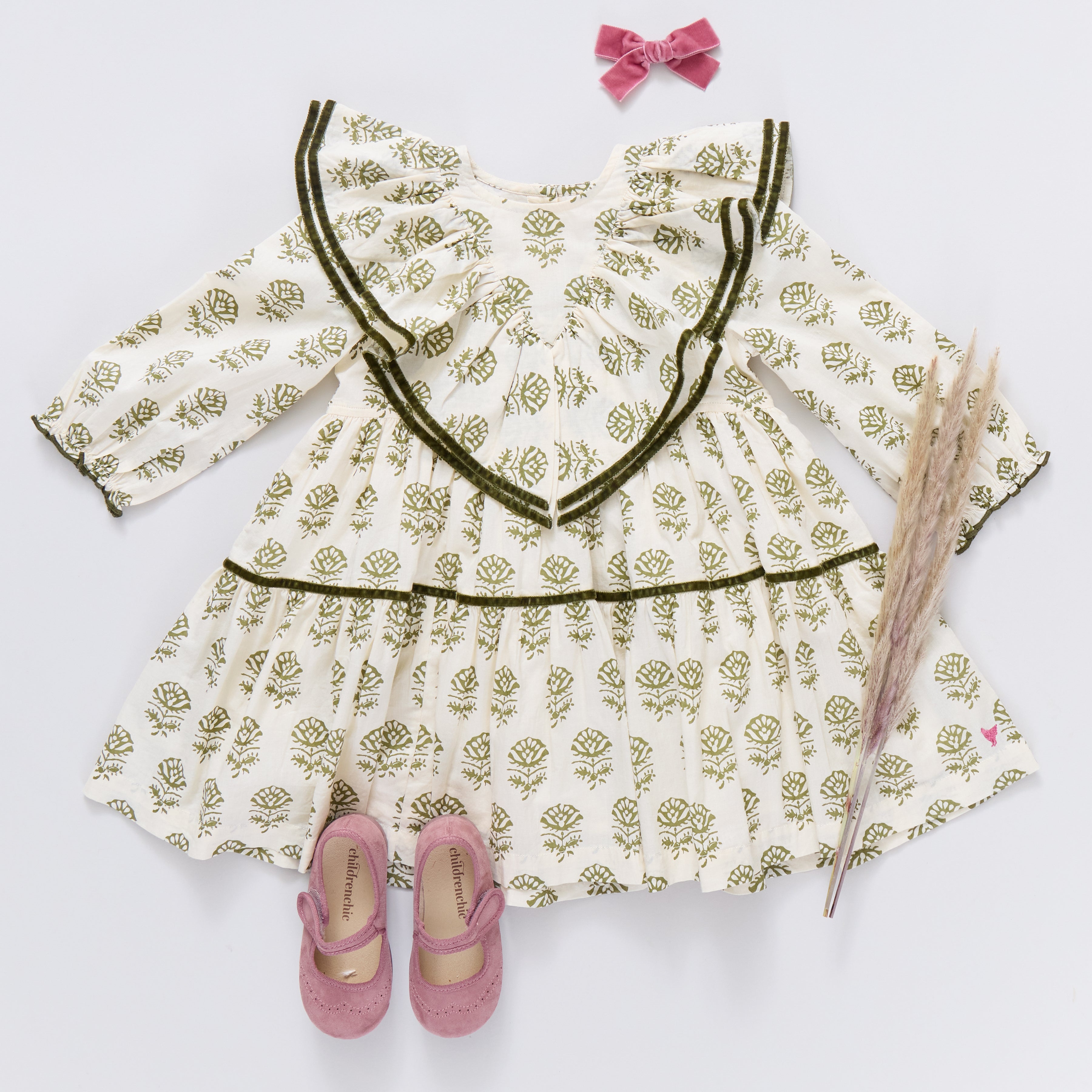 Vintage Vibes! Our long sleeve Girls Raphaela Dress seamlessly moves from school days to ice cream socials. A velvet-taped, pointed ruffle bib detail flutters at the front and lends a sense of nostalgia and the fully lined two-tiered skirt encourages twirling until twlight. A glitter button closure at the back add subtle sparkle. Available in Strawberry Cream Polka Dot and Olive Rose Floral.