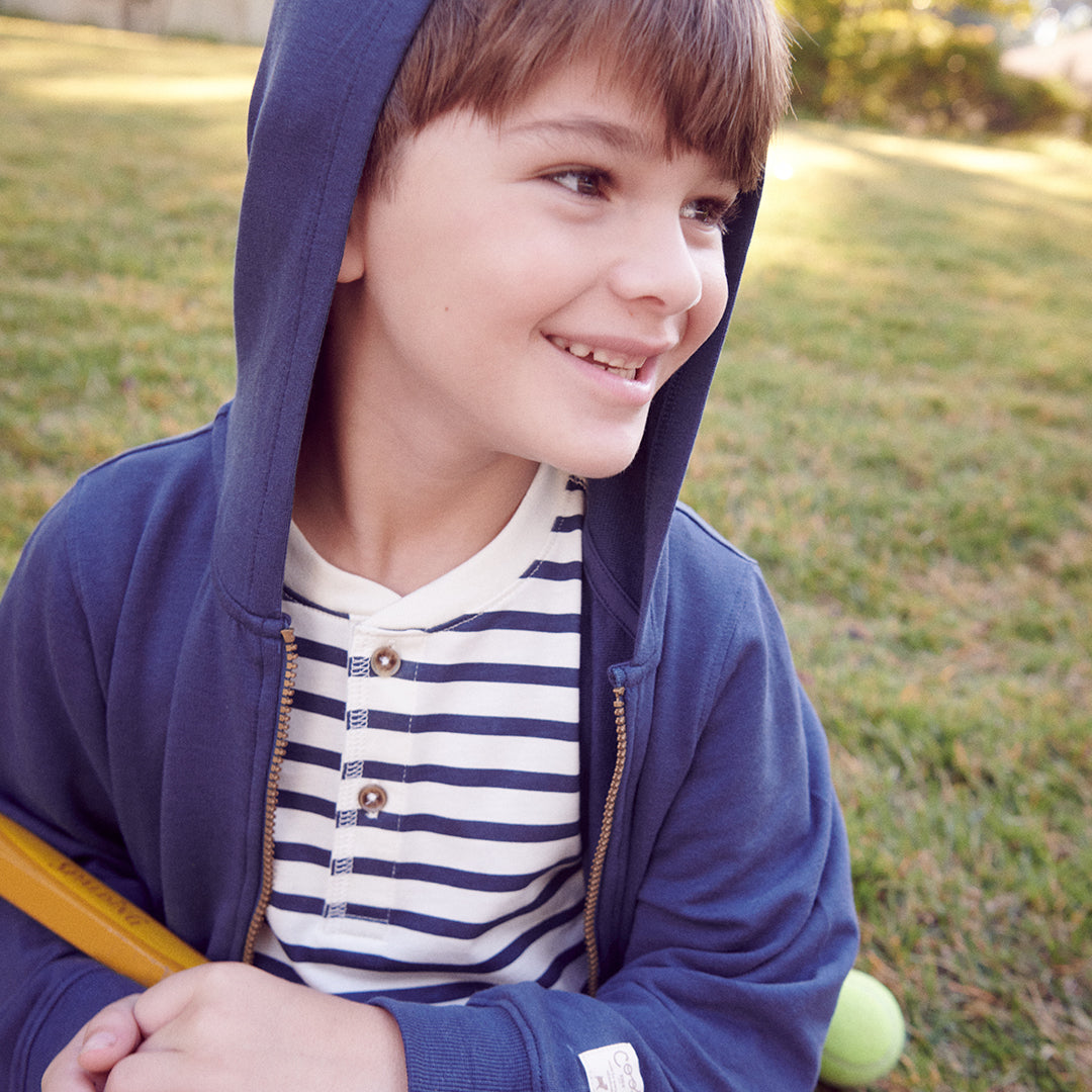 Cozy, cool, and ready for adventure! The real star here is our super-soft French Terry, making this zip-up hoodie a go-to for everyday fun. Designed with roomy front pockets (perfect for stashing all those found treasures!) and finished with ribbed cuffs and waist for a comfy fit. Pair it with our Jax Jogger for the ultimate play-all-day ensemble!