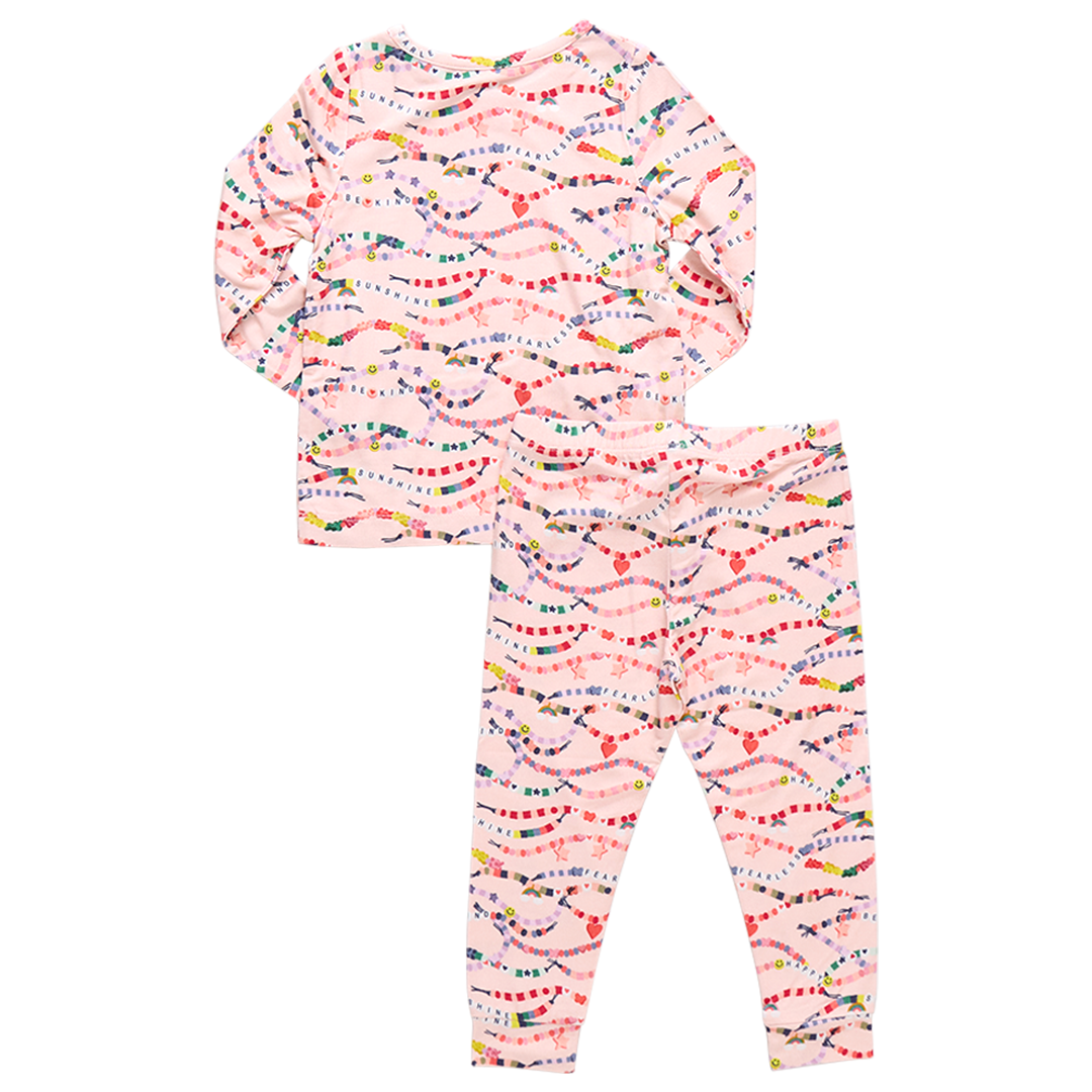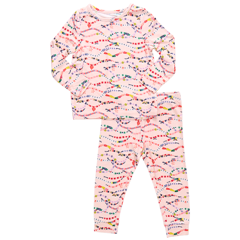 In our Friendship Bracelet Era! This exclusive new print, inspired by your favorite superstar, is a must-have for your stylish kiddos. This nostalgic print highlights positive messaging such as kindness, happiness and friendship - and is the perfect set for dancing around the house, or performing in your own at-home concert. Our soft and silky bamboo fabric is best known for its breathability and it keeps littles cool & comfortable in the early fall months (and warm & cozy in the winter!)