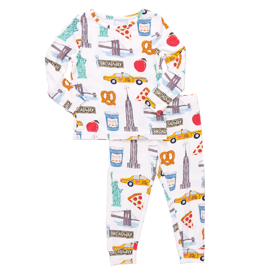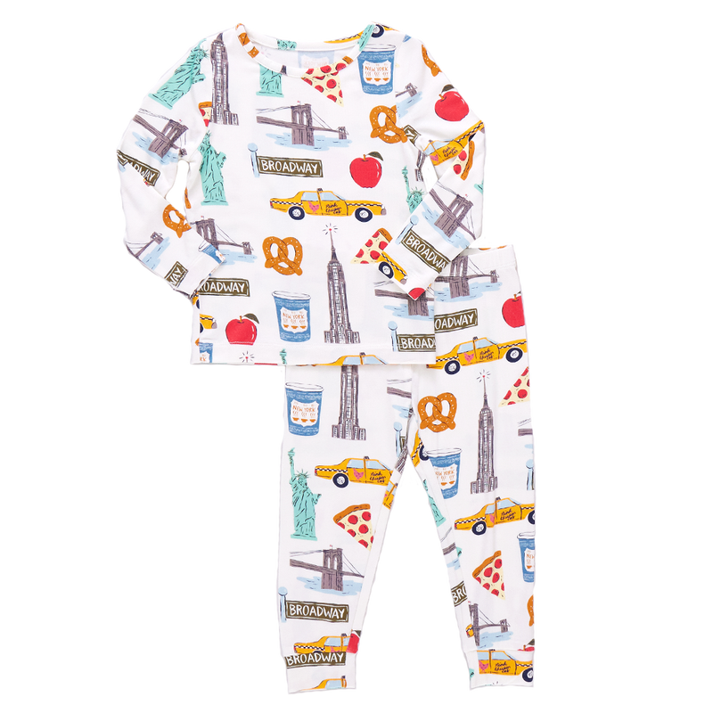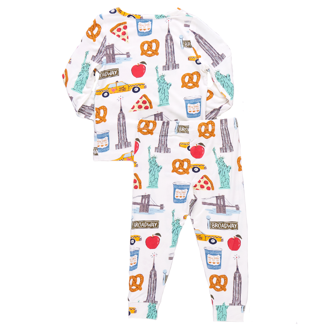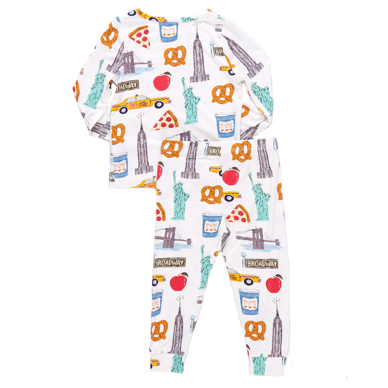New York City never sleeps - but your littles most definitely will in these comfy NYC pajamas! In collaboration with artist Krissy Mast, we are so excited to launch this new PJ print inspired by some of our favorite NYC staples - the Statue of Liberty, Empire State Building, Broadway and even yellow cabs! This statement print is sure to be a keepsake for locals and visitors alike. Crafted in Bamboo fabric, these are crazy soft with a smooth, silk-like texture. Each 2-piece set includes a long sleeve top and elastic waist pant. The best part - bamboo is super breathable and it keeps littles cool & comfortable in the summer (and warm & cozy in the winter!)