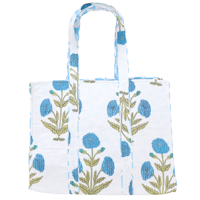 Two For One! Our classically styled Large Reversible Quilted Tote is generously sized to fit a towel, sunblock and juicy novel for an afternoon lounging at your favorite lake, park or shoreline. Two sturdy handles and a handy interior pocket to keep your keys and lip balm within reach make this a smart and stylish choice. Available in Blue Oversized Dandelion / Blue Triangle Check and Pink Bouquet Floral / Pink Triangle Check.