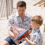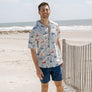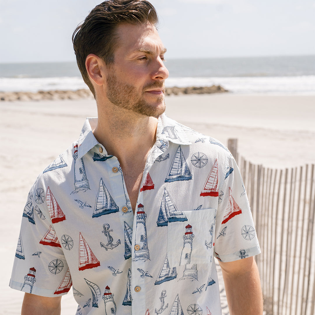 Smooth Sailing! Set sail for summertime fun both on the upper deck and dockside in our collared short sleeve Mens Jack Shirt crafted in our Nautical Adventures print. Full sails, friendly seagulls, lighthouses, anchors and compass stars against a clear blue ground animate this classic conversation print. Designer details on this Pink Chicken classic include faux coconut buttons at the front and a handsome pattern on pattern chest pocket perfectly sized for a compass to lead the way to a fun filled afternoon. You'll find our Nautical Adventures print throughout our Red, White and Blue collection making it easy to match back to Mom, Dad and sibs!