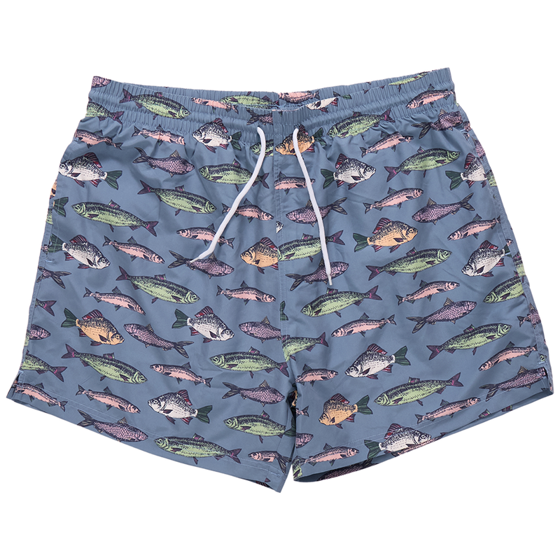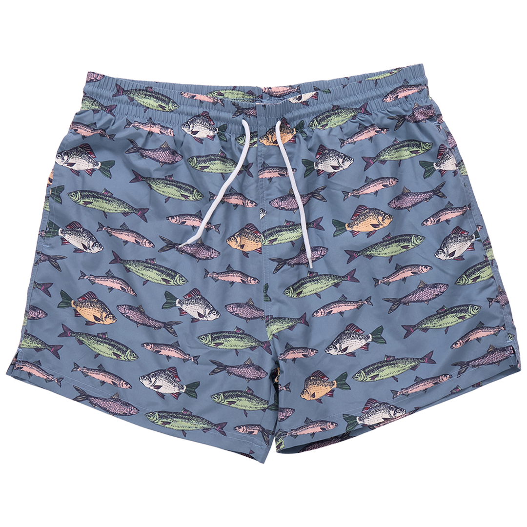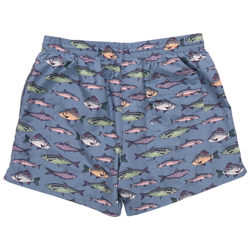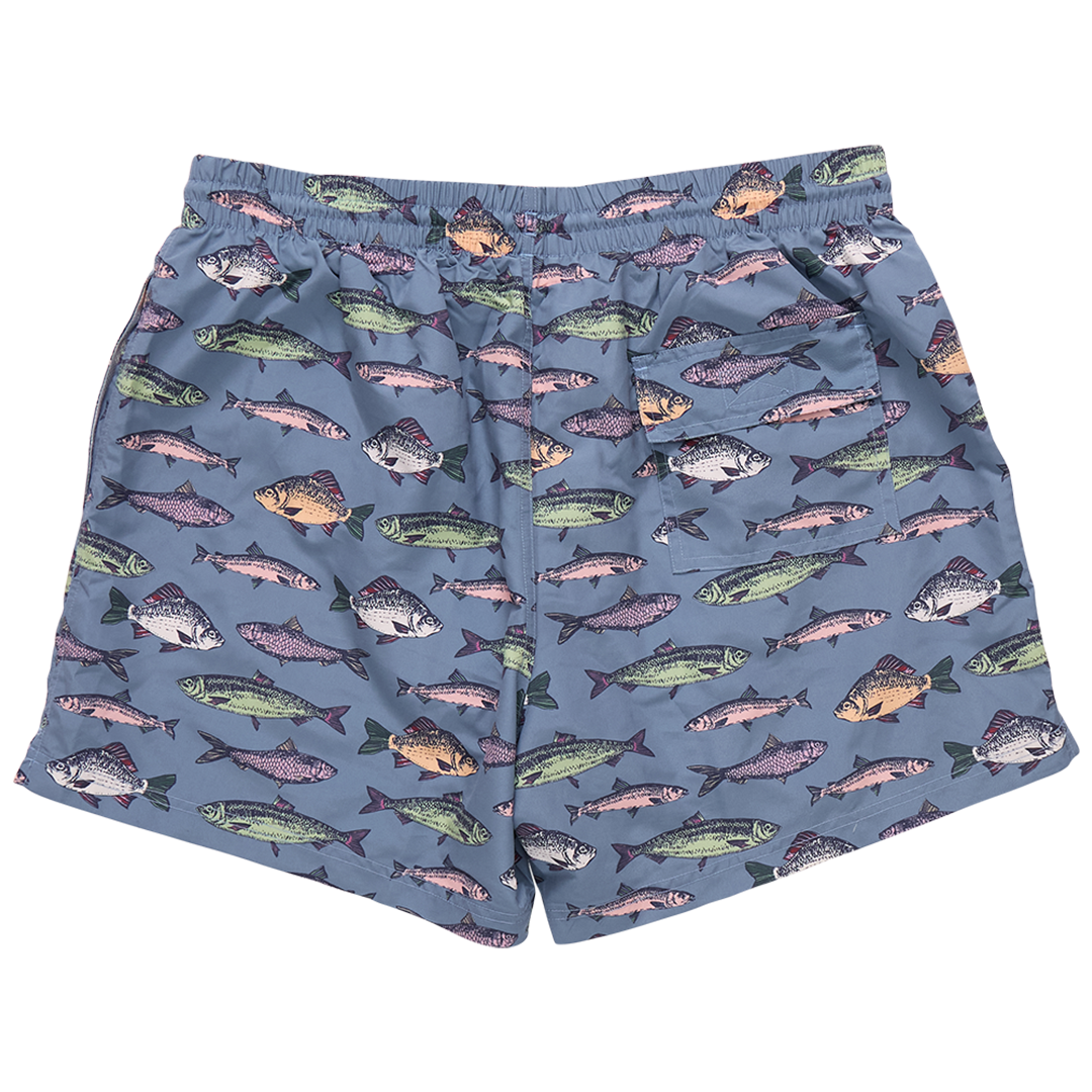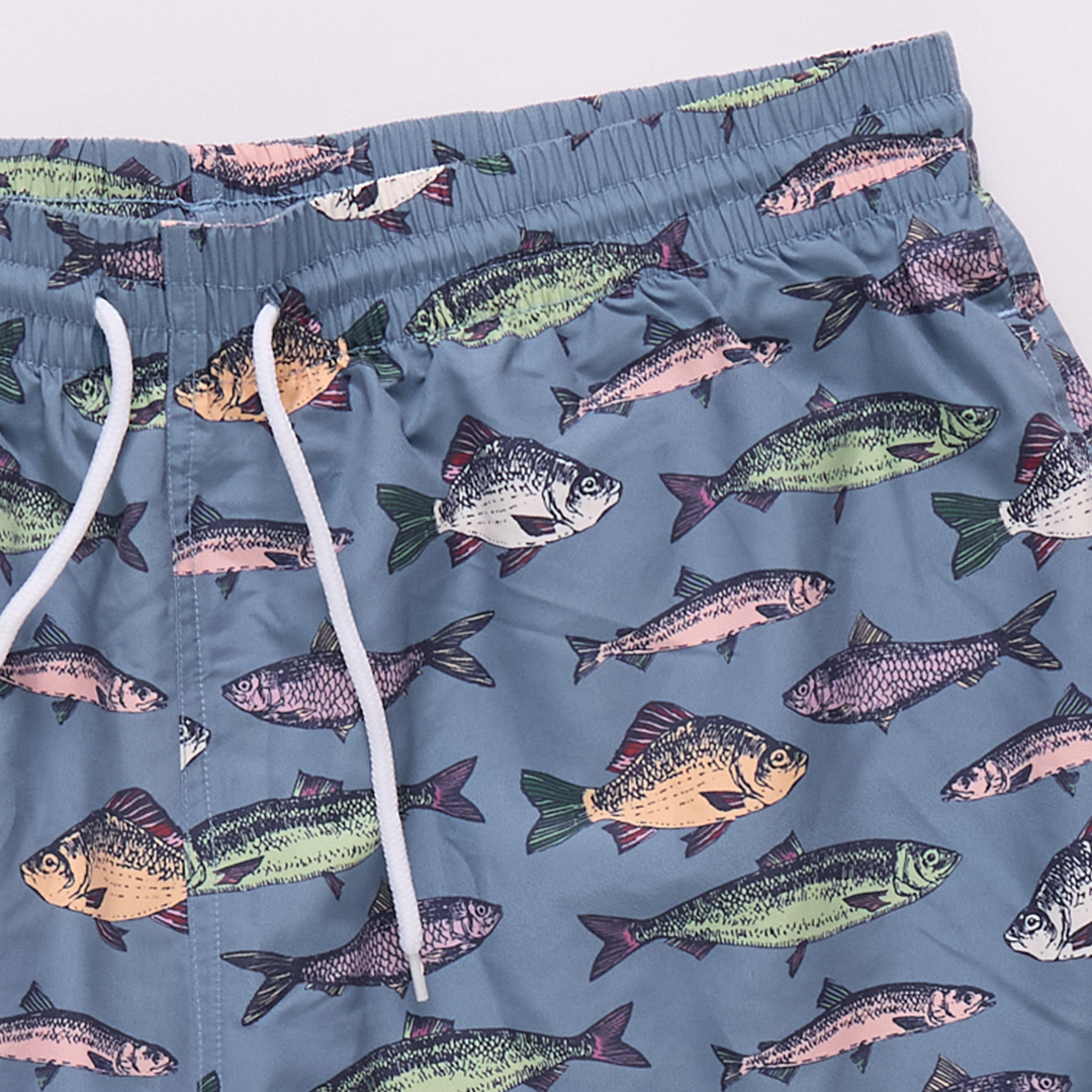 Fishy Fishy In The Water! A colorful school of exotic fish make their way across a cool Bluestone ground on our classic Mens Swim Trunk. Practical features include roomy side pockets and one velcro back pocket. An elasticized waistband adds comfort and easy movement; finished with a faux drawstring-tie closure. Hits above the knee. Mesh lining. You'll find out Multi Fishies print throughout the collection making Daddy & Me moments easy to achieve.