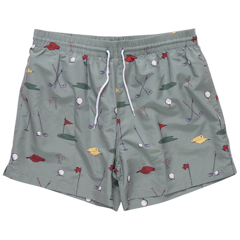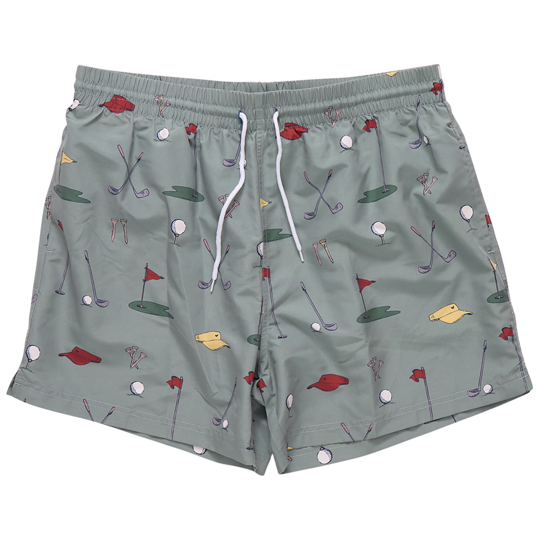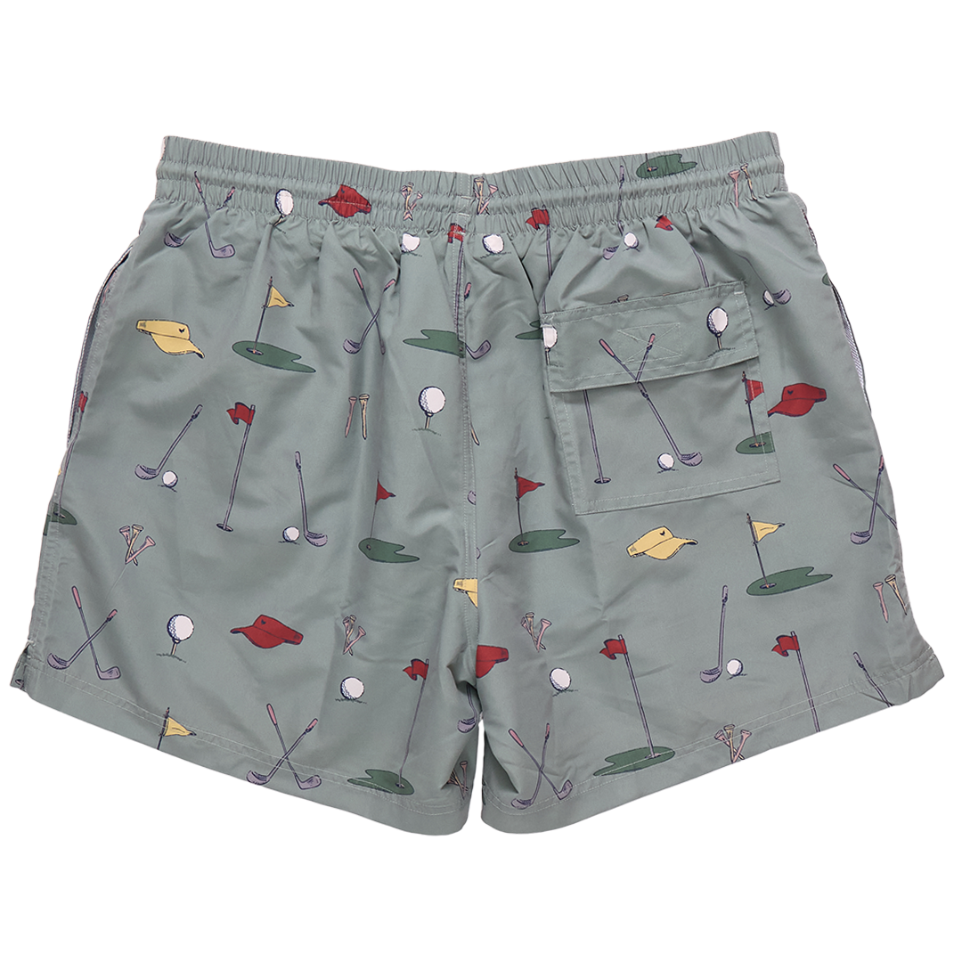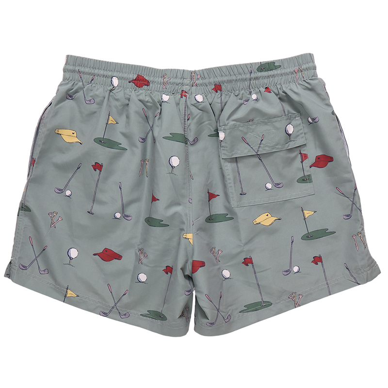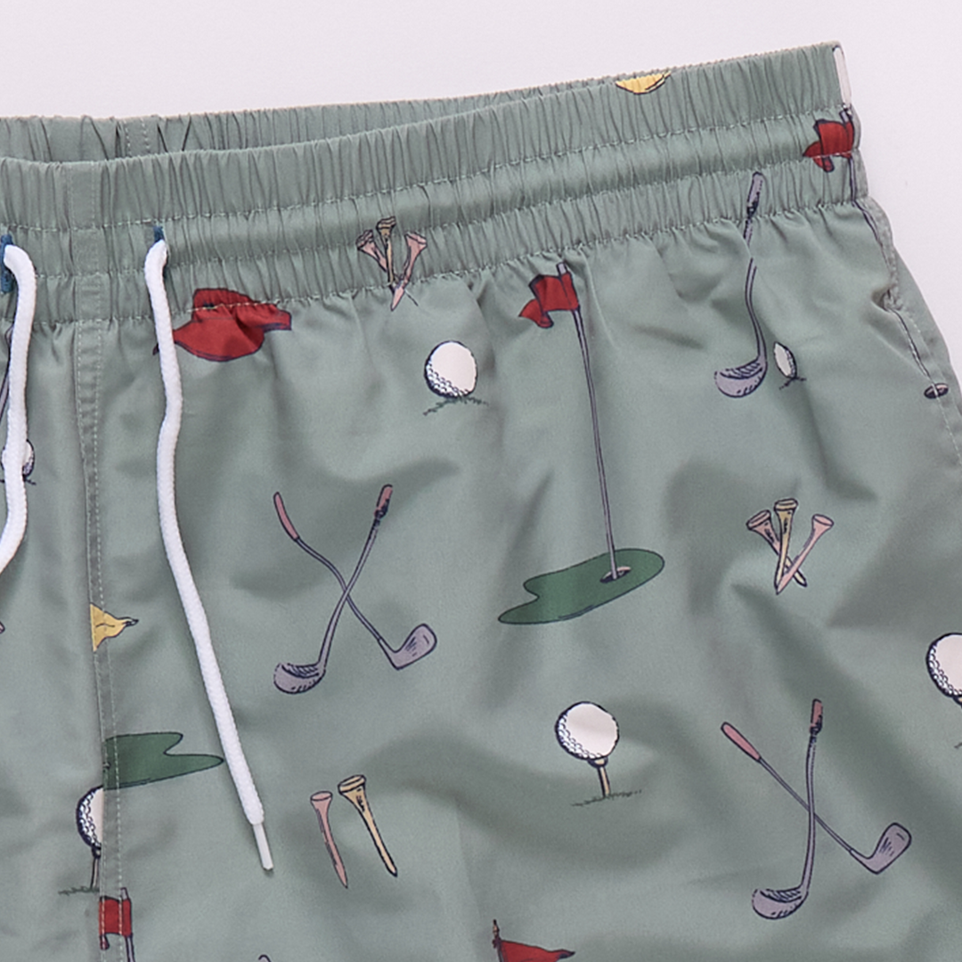 Tee Time! While this cute Green Golf Tournament print won't guarantee a hole in one, we think it's a win on our classic Mens Swim Trunk. Practical features include roomy side pockets and one velcro back pocket. An elasticized waistband adds comfort and easy movement; finished with a faux drawstring-tie closure. Hits above the knee. Mesh lining. Match back to our Boys and Baby Boys Swim Trunks for a Daddy & Me moment.
