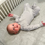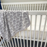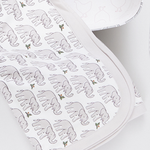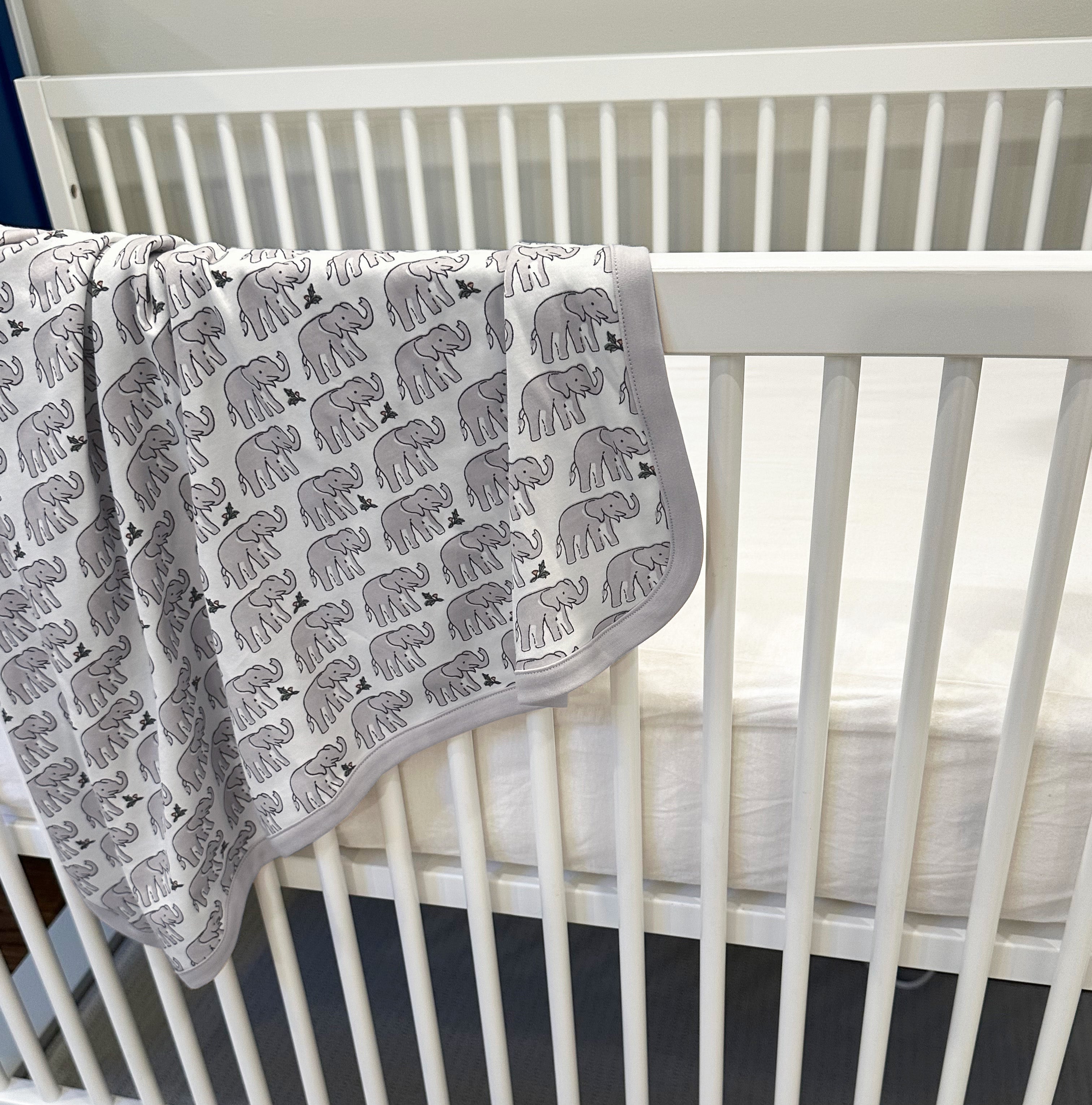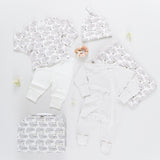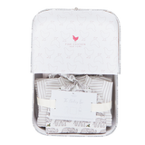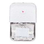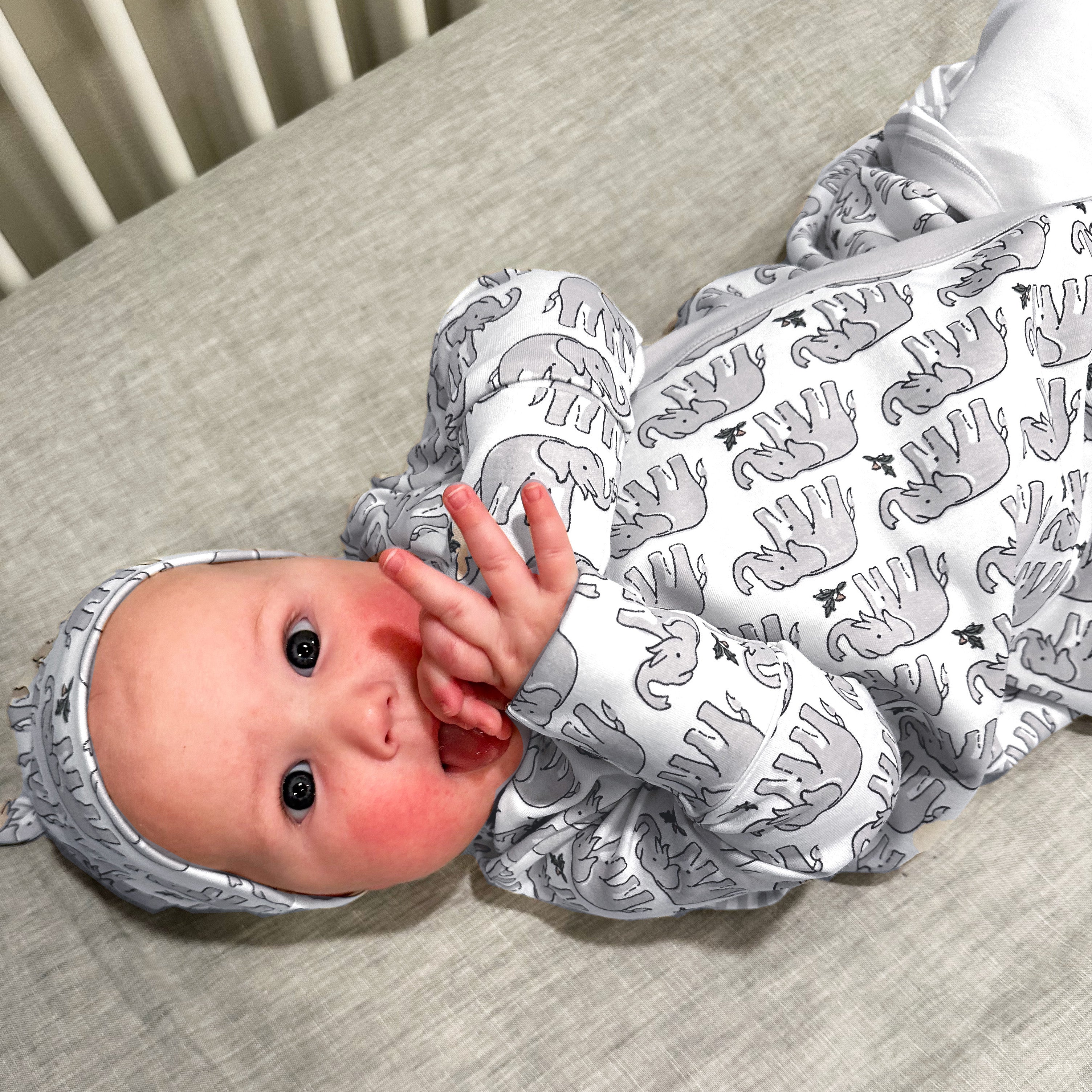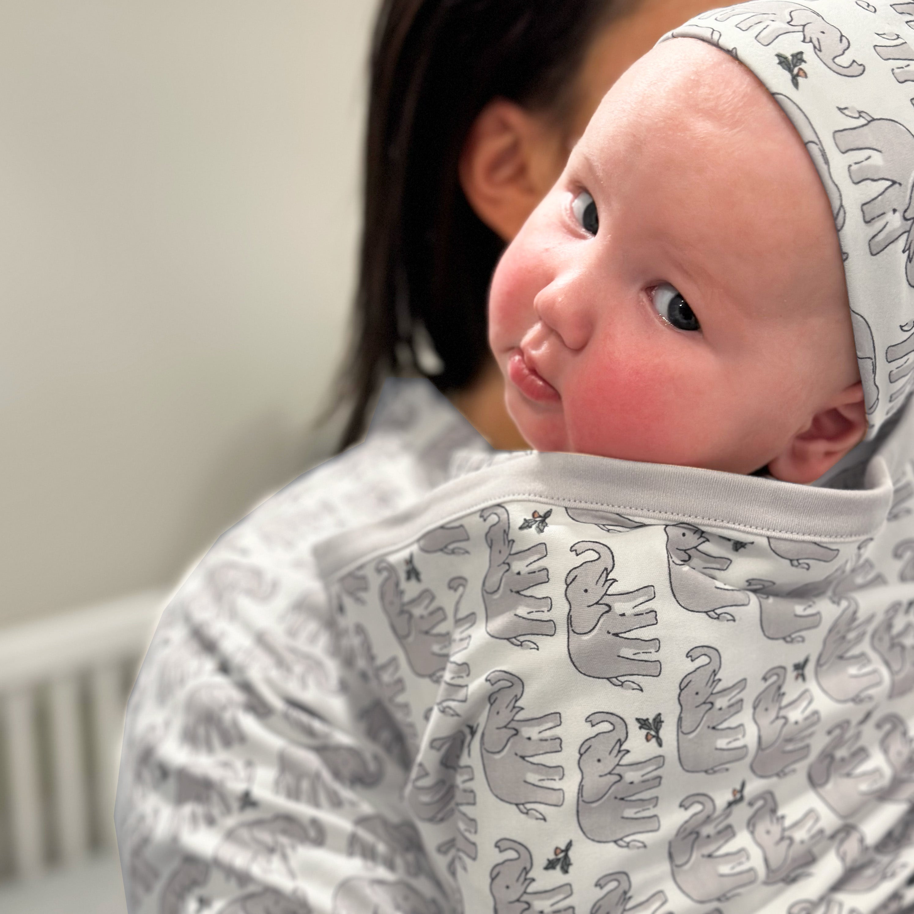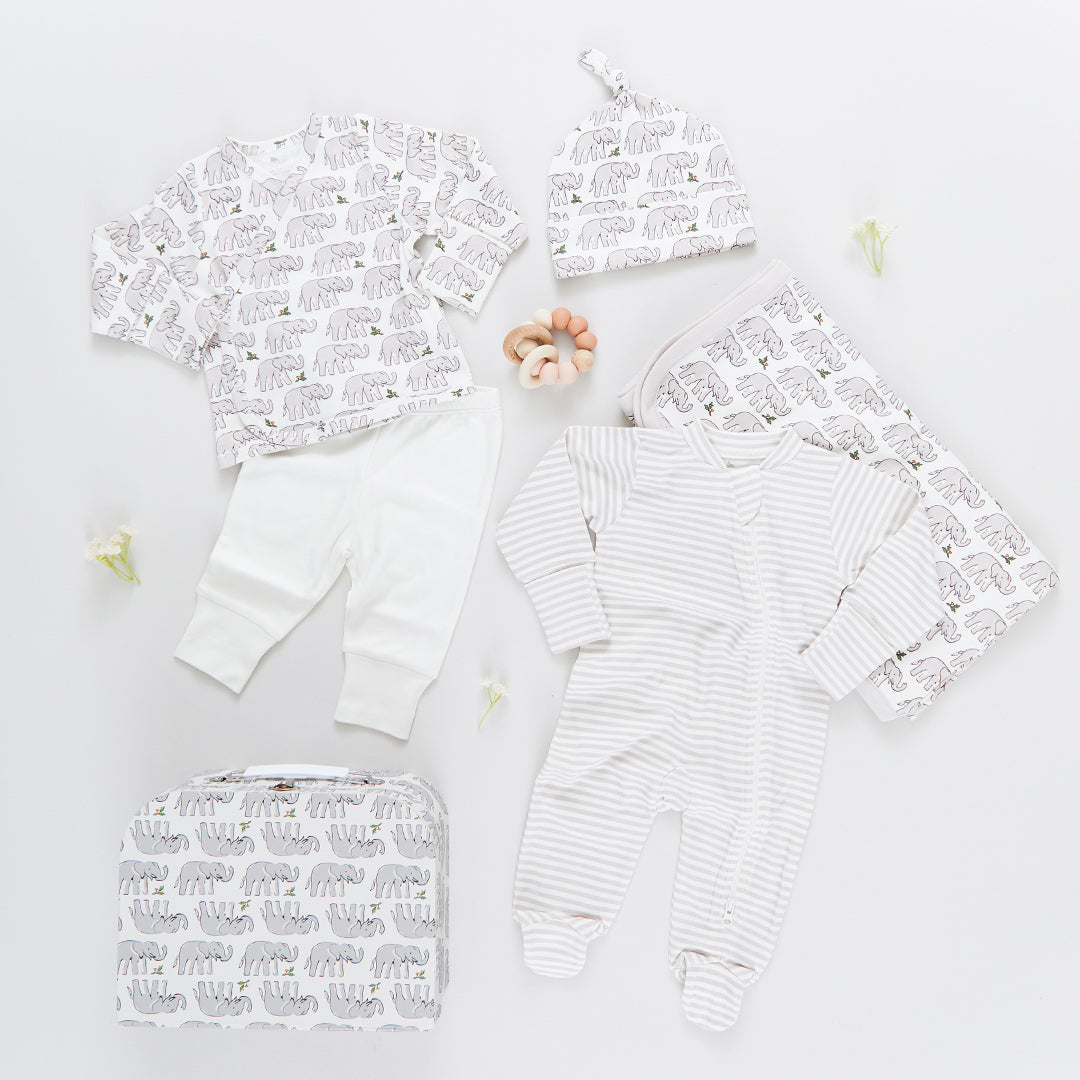 New & Noteworthy! Spoil the newest chicks in your flock by feathering their nest with our new Baby Organic Pima Cotton take home set in Gray Elephant. Inside an adorable printed mini-suitcase rests a complete collection of newborn necessities in classic Pink Chicken prints and patterns. Box includes: one printed wrap top with fold-over mittens, one elastic waist solid pant, one printed knotted hat, one long sleeve zipper footie with fold-over mittens and zipper protector and one printed take home blanket with contrasting print on reverse side. It's the perfect newborn gift set for your work bestie, favorite cousin, roommate from college or any new mom in your life. Keep mom and baby connected with our matching Womens Organic Pima Cotton Robe. GOTS certified. Inks & dyes classified as eco-friendly by OEKO-TEX standard.