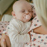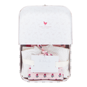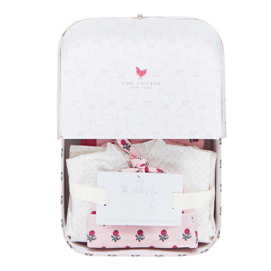 Spoil the newest chicks in your flock by feathering their nest with our new Baby Organic Pima Cotton take home set in Pink Tiny Flower. Inside an adorable printed mini-suitcase rests a complete collection of newborn necessities in classic Pink Chicken prints and patterns. Box includes: one printed wrap top with fold-over mittens, one elastic waist solid pant, one printed knotted hat, one long sleeve zipper footie with fold-over mittens and zipper protector and one printed take home blanket with contrasting print on reverse side. It's the perfect newborn gift set for your work bestie, favorite cousin, roommate from college or any new mom in your life. Keep mom and baby connected with our matching Womens Organic Pima Cotton Robe. GOTS certified. Inks & dyes classified as eco-friendly by OEKO-TEX standard.