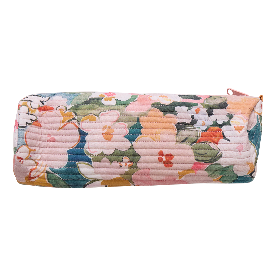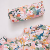 Pencil Pushers! Our adorable back to school printed Pencil Cases fit a generous assortment of colored and graphite pencils, erasers and your favoirte pens too! Crafted in some of our fall favorite prints, this barrel shaped case zips at the center and has a coordinated fabric loop at each side. Available in Colored Pencils, Navy Carnation, Watercolor Floral, Flying Footballs, and Burgundy Garden Floral.