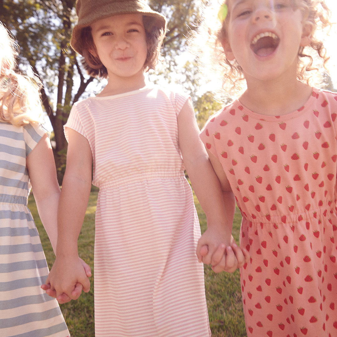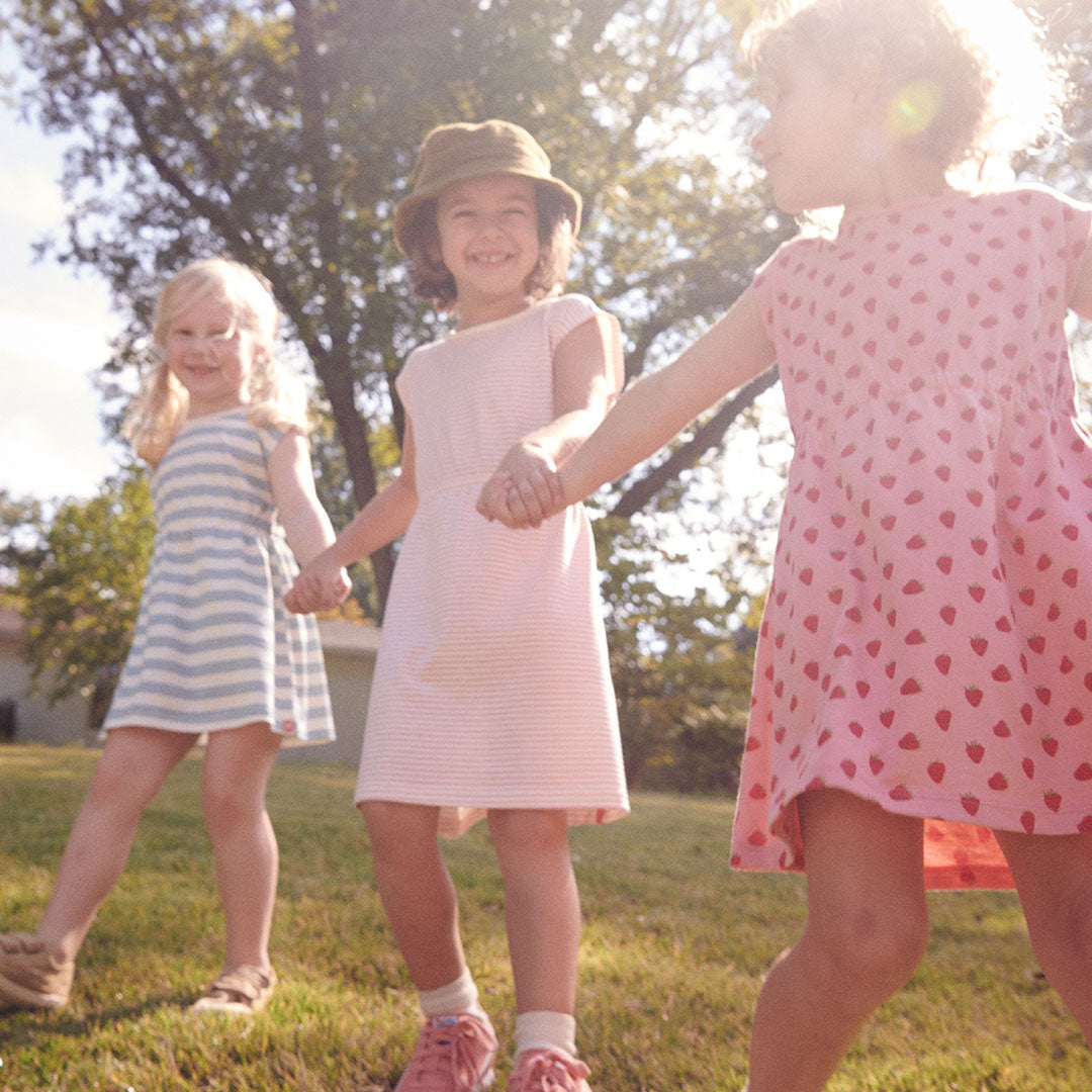 Our sleeveless Playground Dress is made for non-stop fun, from classroom creativity to backyard adventures and all the cartwheels in between. The comfy cinched waist keeps things stylish, while the easy-breezy design lets her climb, twirl, and zoom around without a care. Just add our leggings or banana bike shorts, and she’s set for monkey bars, tea parties, and everything in between. Available in a trio of fun stripes and vintage prints, with a Coop logo loop at the hem for extra charm!