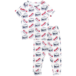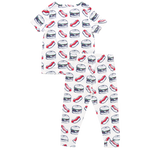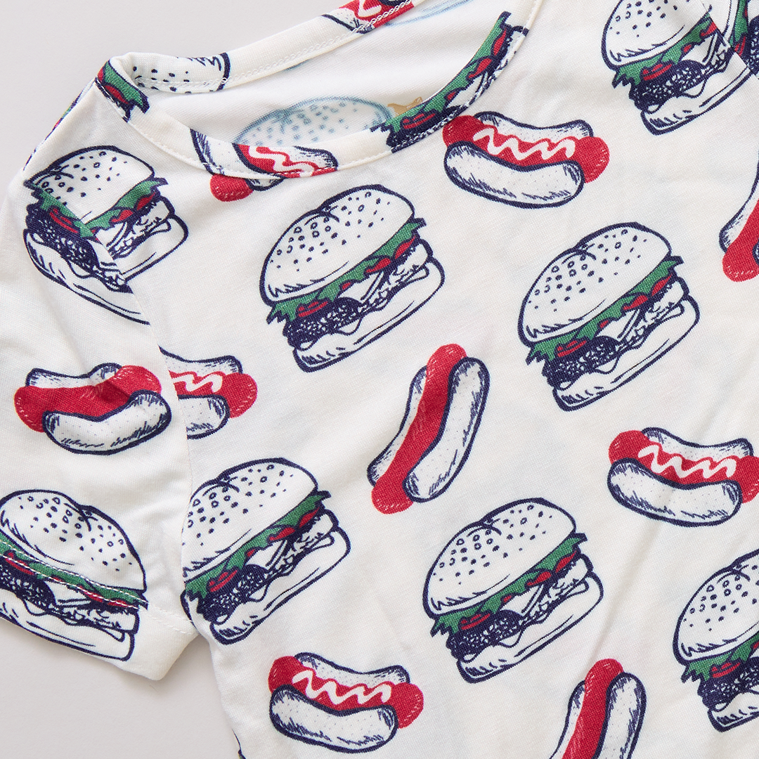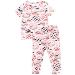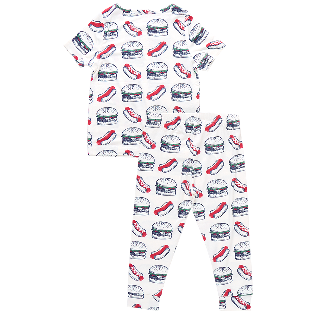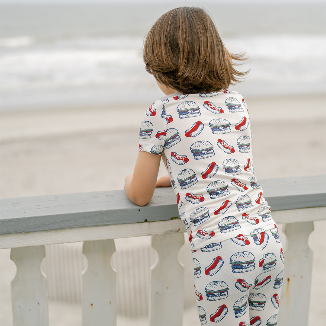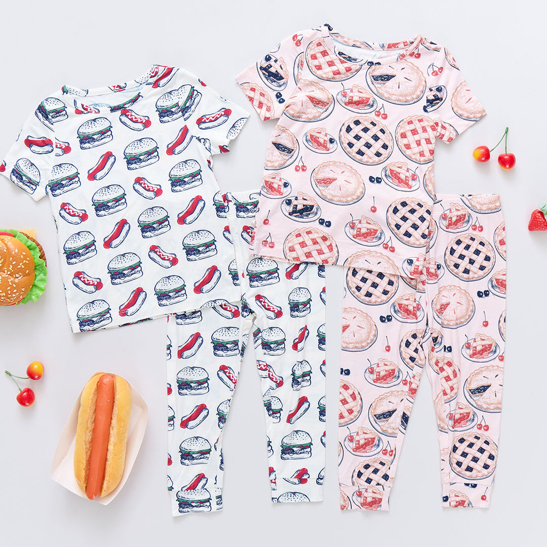 Cozy Up! Whether at Grandmas house or in your besties back yard, summer sleepovers have unlimited potential when you are hanging around in our extra cozy Kids Bamboo PJ Sets. Crafted in Bamboo fabric, these are crazy soft with a smooth, silk-like texture. Each 2-piece set includes a short sleeve top and elastic waist pant. The best part - bamboo is super breathable and it keeps littles cool & comfortable in the summer (and warm & cozy in the winter!) Available in Hamburger Hotdog, Pinwheels, Nautical Notions and Grandmas Pie.
