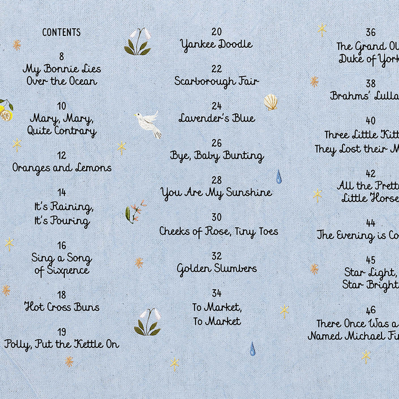This treasury gives parents the opportunity to rediscover just how useful (and calming) 30 of the best-loved lullabies and nursery rhymes are in one, beautiful volume. Stunningly embroidered illustrations for each rhyme offer little ones a visual delight and will make this book a keepsake to treasure.