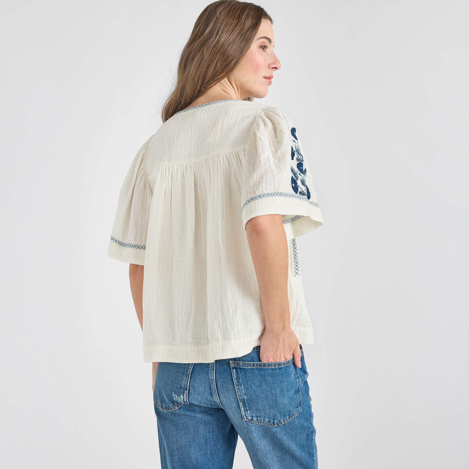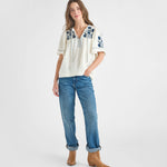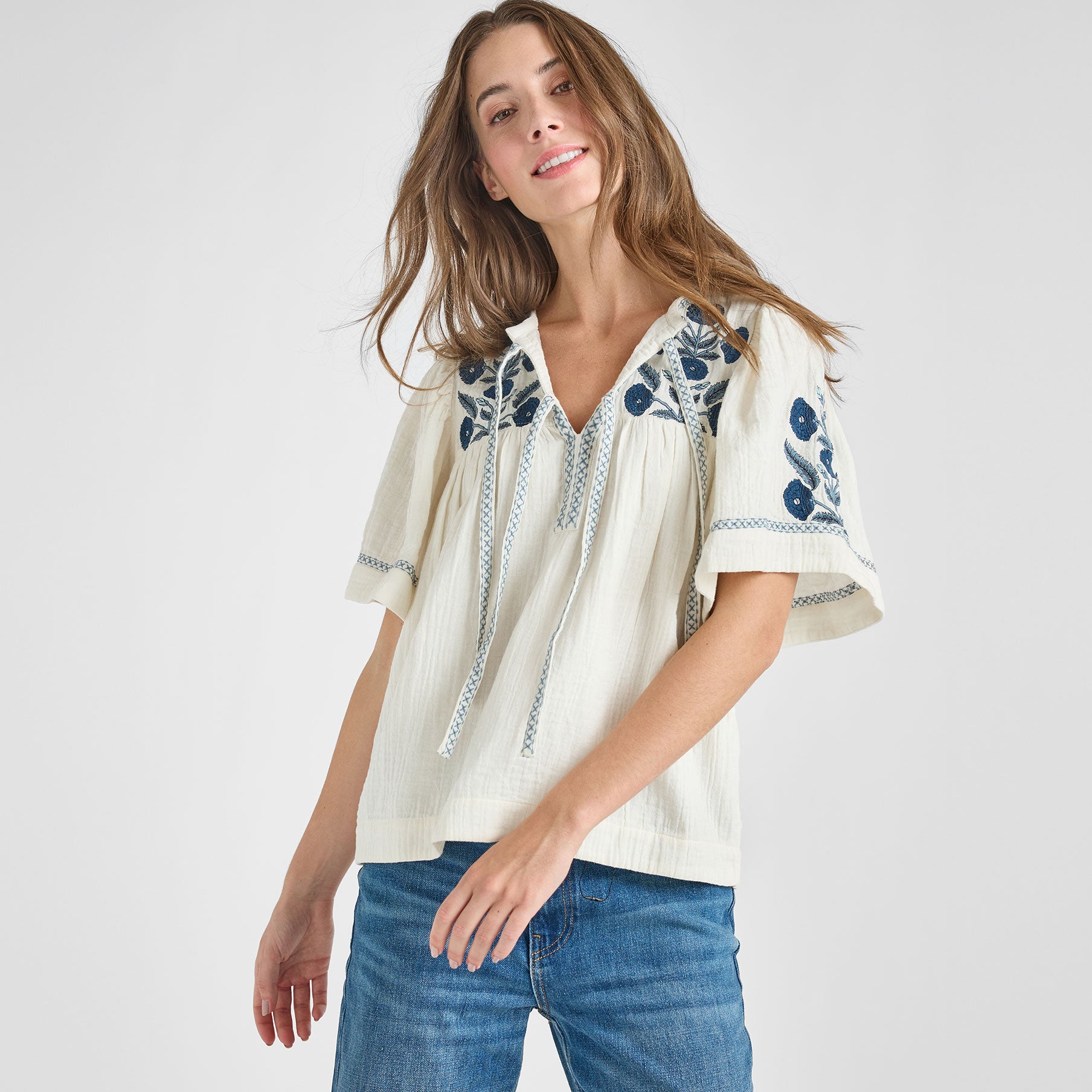 New Silohuette! Our new-to-the-collection Womens Luca Top in Antique White Dandelion Embroidery is a true expression of our classic vintage boho sensibility. This breezy cotton gauze blouse features our classic Dandelion print delicately embroidered in blue thread on the chest and bellflower sleeve. A double tie at the split neckline offers coverage if you want it. Pair with your favorite jeans and a sneaker or ankle boot for your Fall go-to look. 100% cotton double cloth gauze.