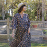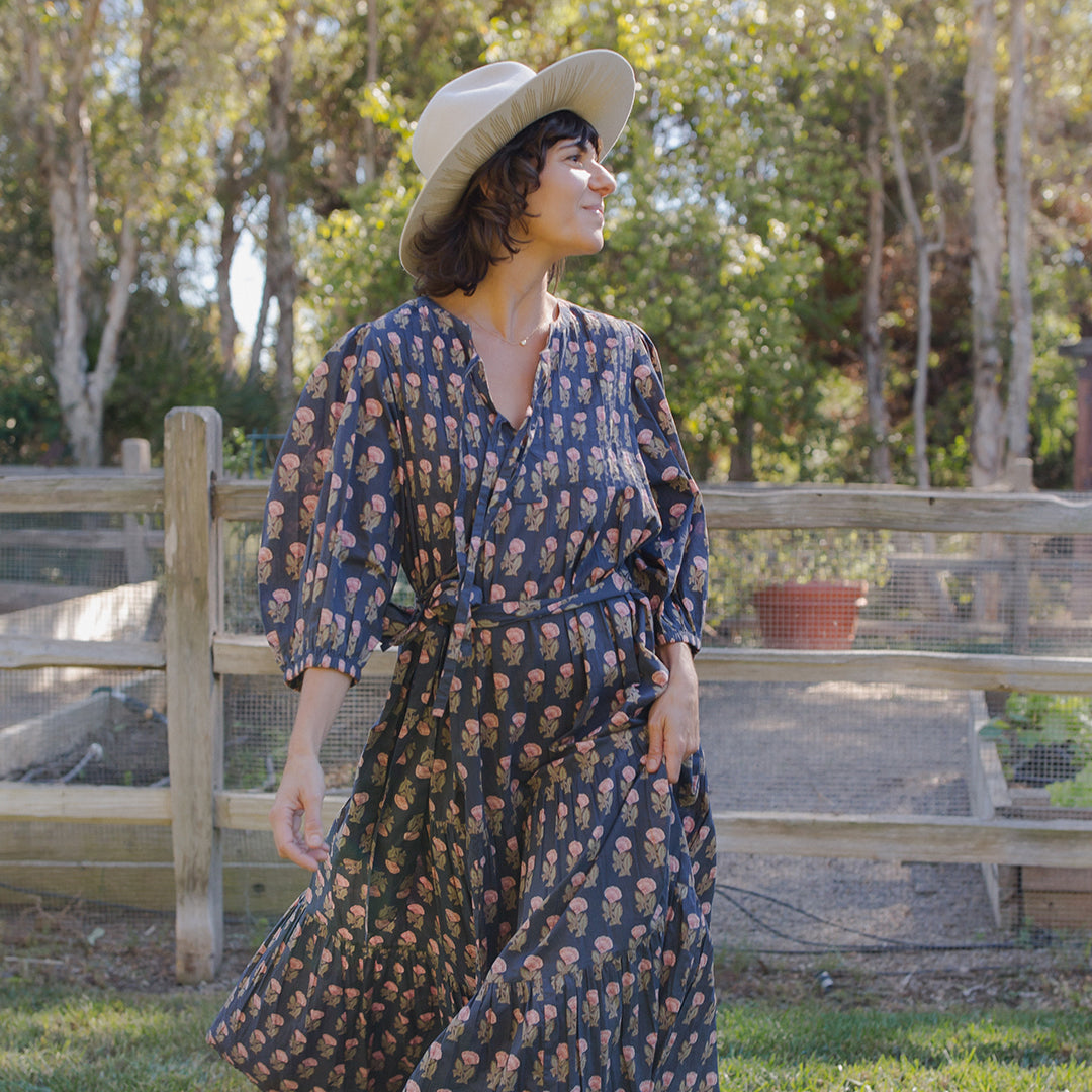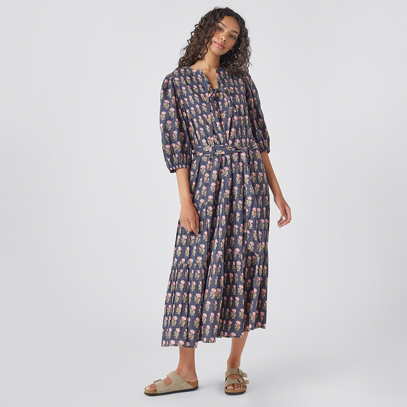 Springing Up In New Colors! Our collection classic Womens Pintuck Indira Dress steps out this Spring in a versatile array of patterns and colors that highlight the traditional Indian block prints that we love so much. This much loved style features a pintucked detail at chest, double tie closure v-neck, gathered 3/4 puff sleeves and a form flattering removable belt make this easy to wear dress flattering for all women, including expectant mamas! Worn casually with a comfy sneaker or dressed up with a leather boot, this partially lined, full length piece will surely become one of your Spring staples. Available in Navy Flower Drop, Blue Flowerette and Pink Lisbon Floral.