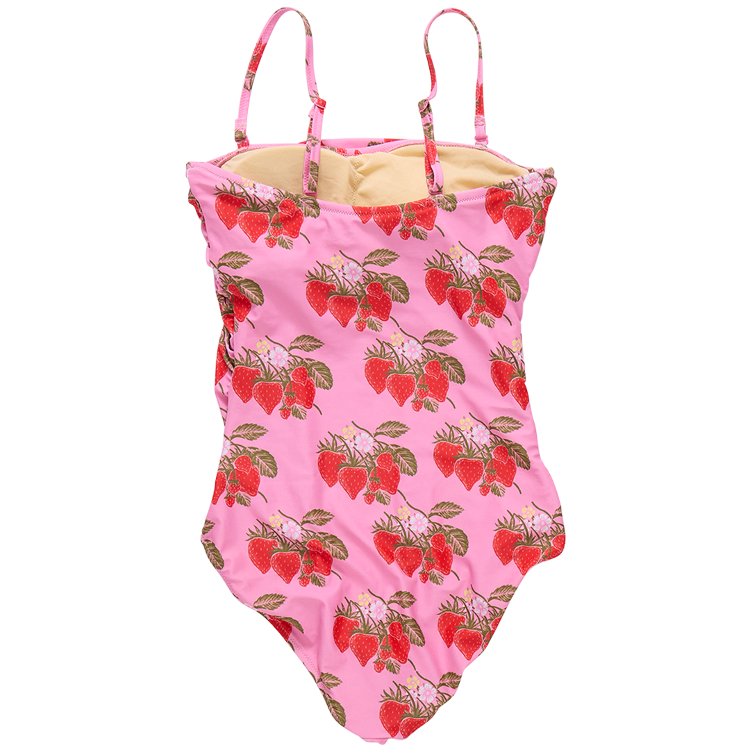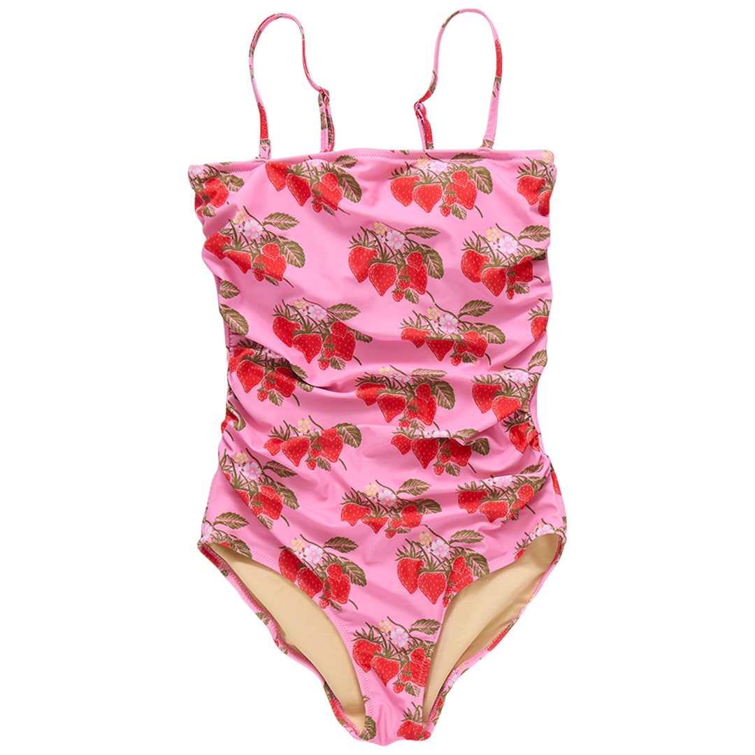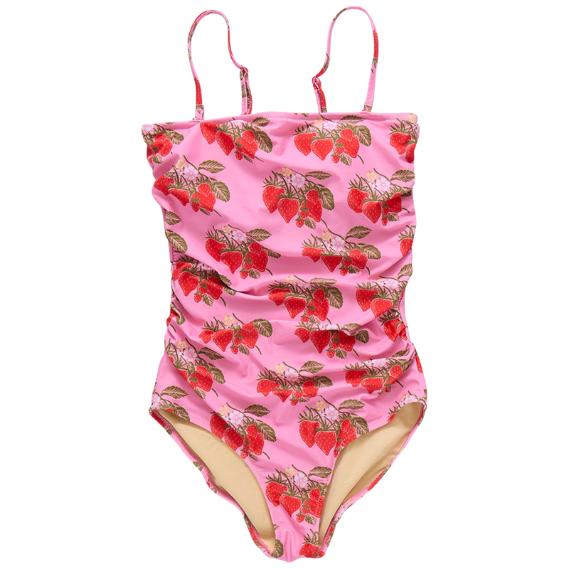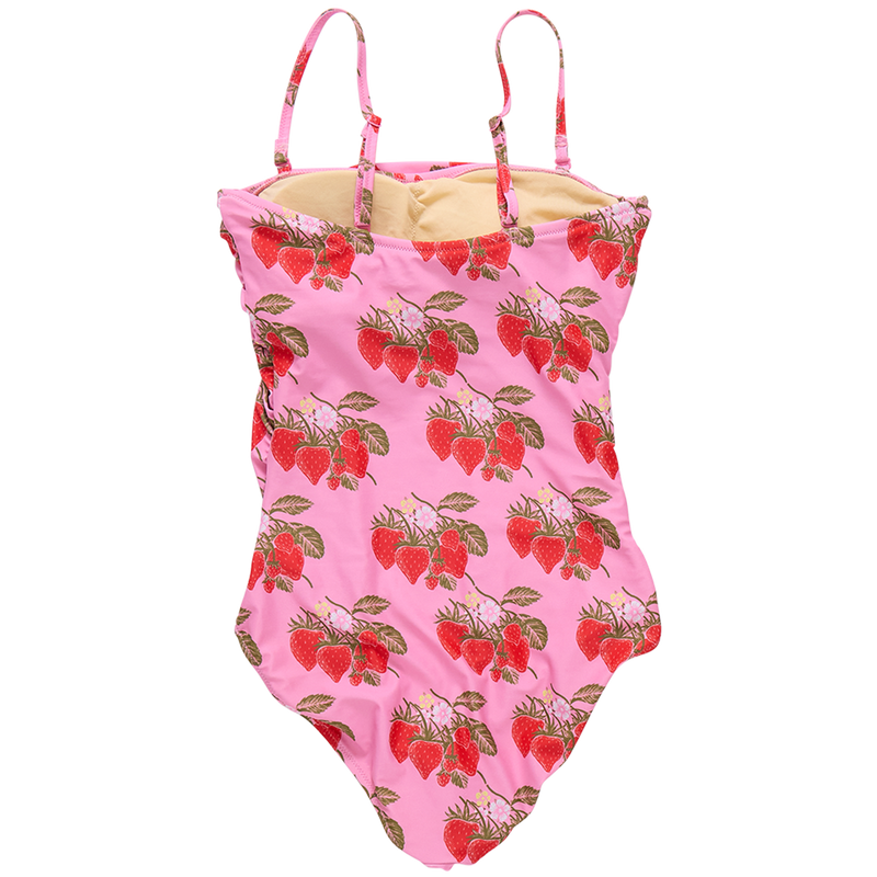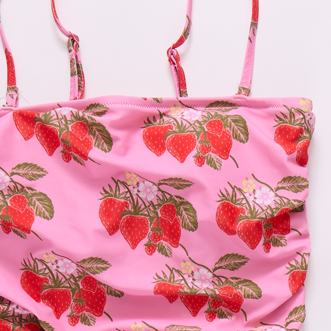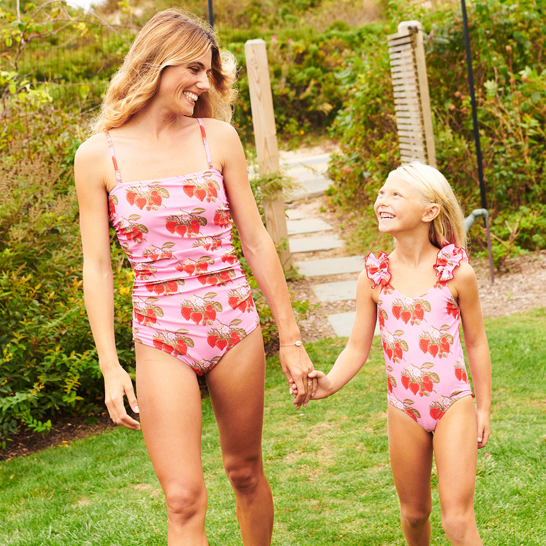 Berry Delightful! Vine ripened Wild Strawberries make a delicious statement our flock favorite Womens Sam Suit. Side ruching creates a flattering silhouette, while adjustable shoulder straps and a built in shelf bra offer just the right amount of support. This swimsuit strikes the perfect balance between lounging poolside and wave jumping with the kids. Match with our Baby Girls and Girls Rash Guard Set or our Girls Via Suit for a playful Mommy & Me moment