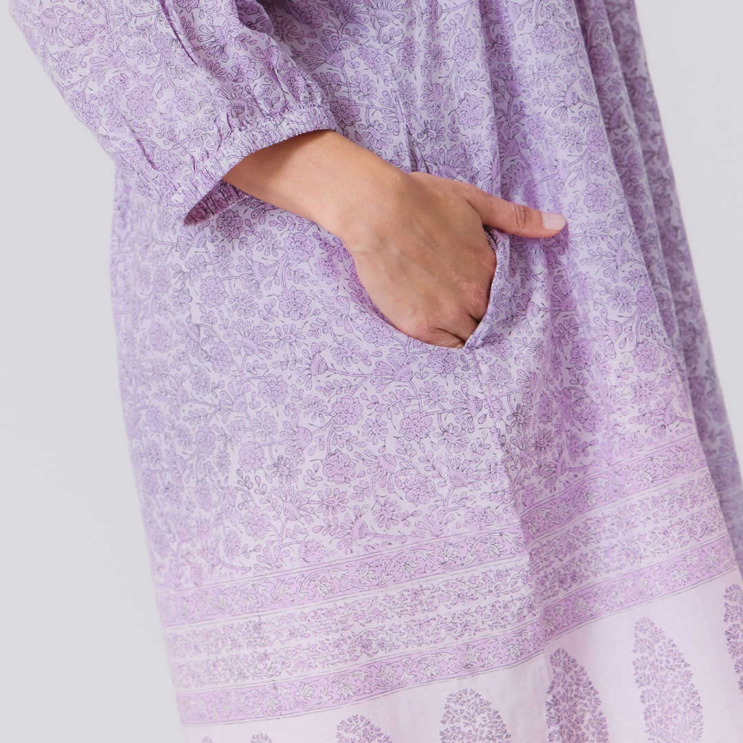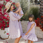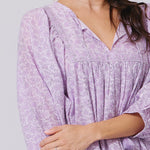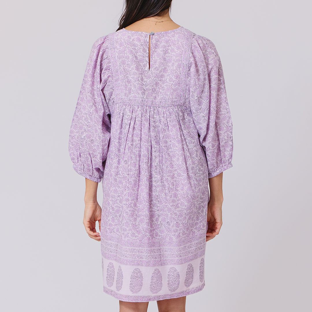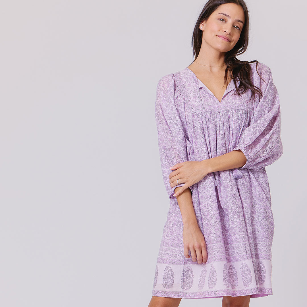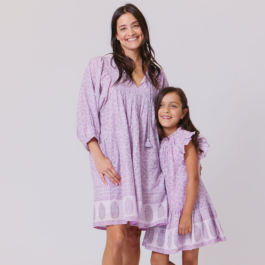 Sweet Lavender Dreams! Our versatile Womens Sanaa Dress, crafted in our dreamy Lavender Garden Floral, is the perfect piece for work, play and impromptu summer soirees. This generously cut silhouette wears beautifully on all shapes including expectant mamas! Design highlights include gathered 3/4 length puff sleeves, an eye catching contrasting border print and tasseled ties at the chest. A faux shell button at the back secures the simple keyhole button closure. Match back to your little chicks in our Baby Girls Jaipur 2-piece Set and Girls Harper Dress.