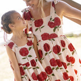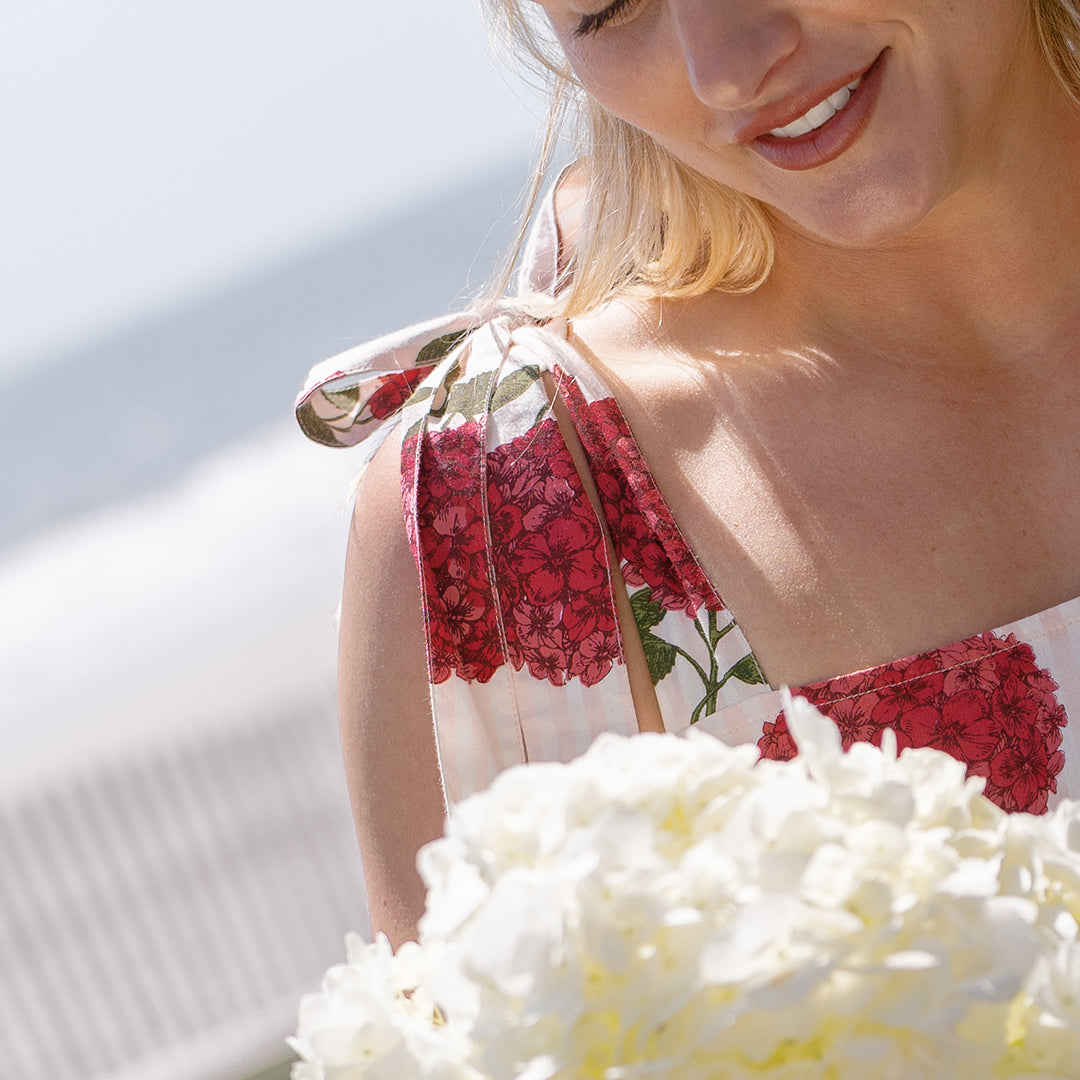 Power Flower! Our favorite fuchsia flower pops against a subtle petal pink and white striped ground in our quintessentially summer Pink Stripe Hydrangeas print. The realistically depicted blooms bring our collection classic Women's Sierra Dress to life. This flattering single-tiered silhouette features a smocked upper back, adjustable tie shoulder straps and an invisible zipper closure at back. Match back to your girls in our Girls Via Dress and Baby Girls Via Jumper in Pink Hydrangeas Stripe for a stunning garden party trio!